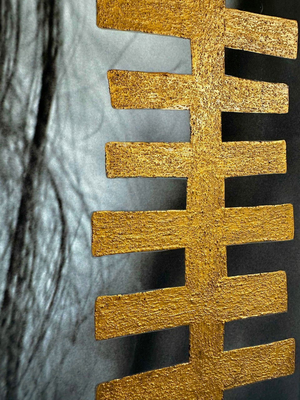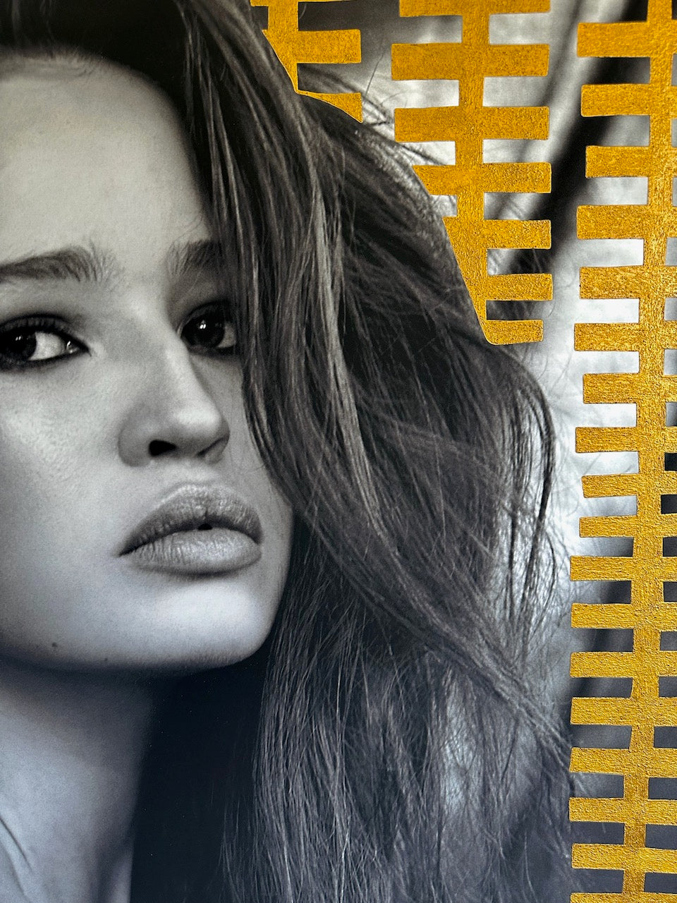 The original photographic image is printed with archival pigment inks on 310gsm Ilford cotton rag paper. Persefone has used a natural sand acrylic medium with gold pigment powder to paint the textured Greek-inspired elements directly onto the supersized, museum-grade photographic print.