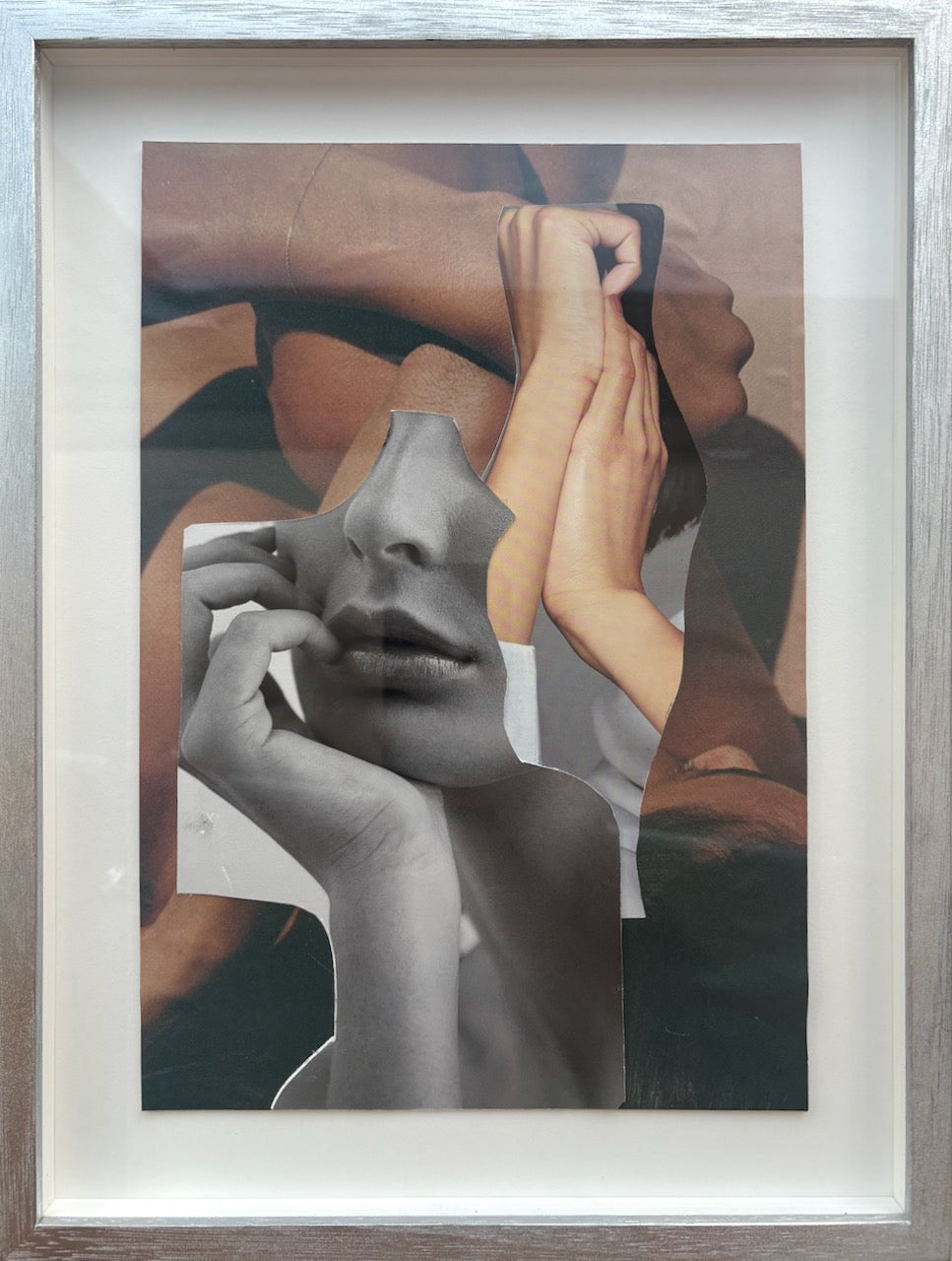 Inspired by the layered plates of fashion magazines and the geometric forms of Andrew Ho’s black and photography, Andrée brings together a collage that resists any recognisable aesthetic. Instead, In-Between Silence presents fragments of the human form; individual figures in a mysteriously disjointed, yet beautifully intertwined composition.