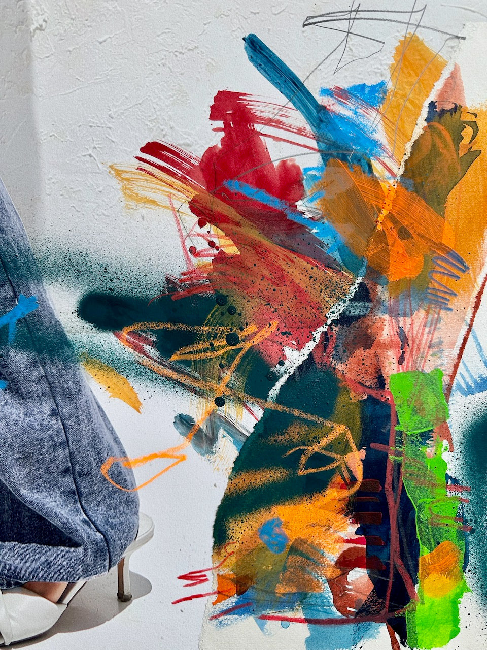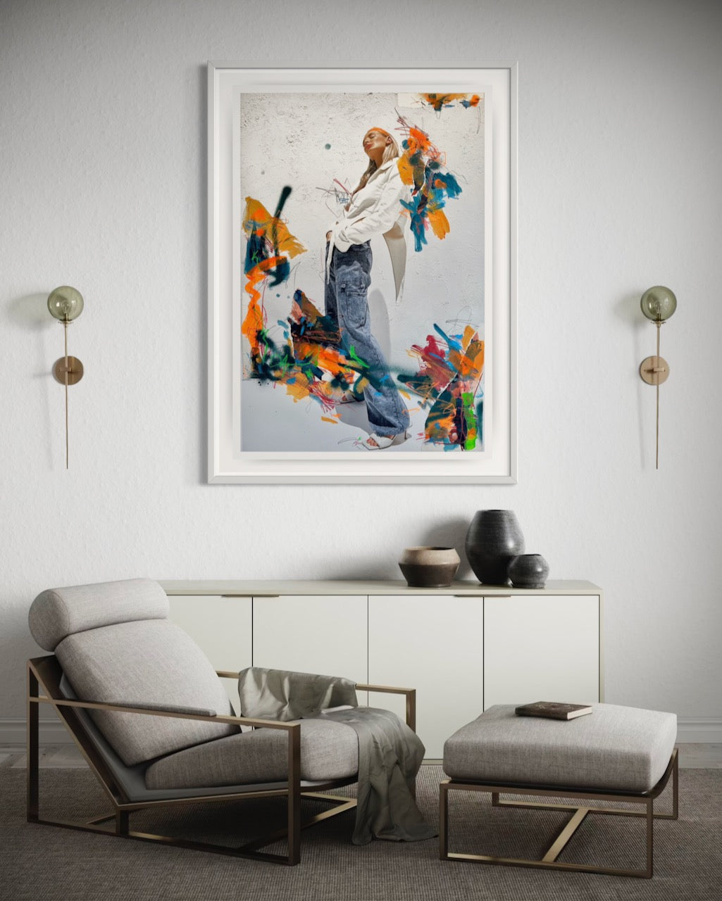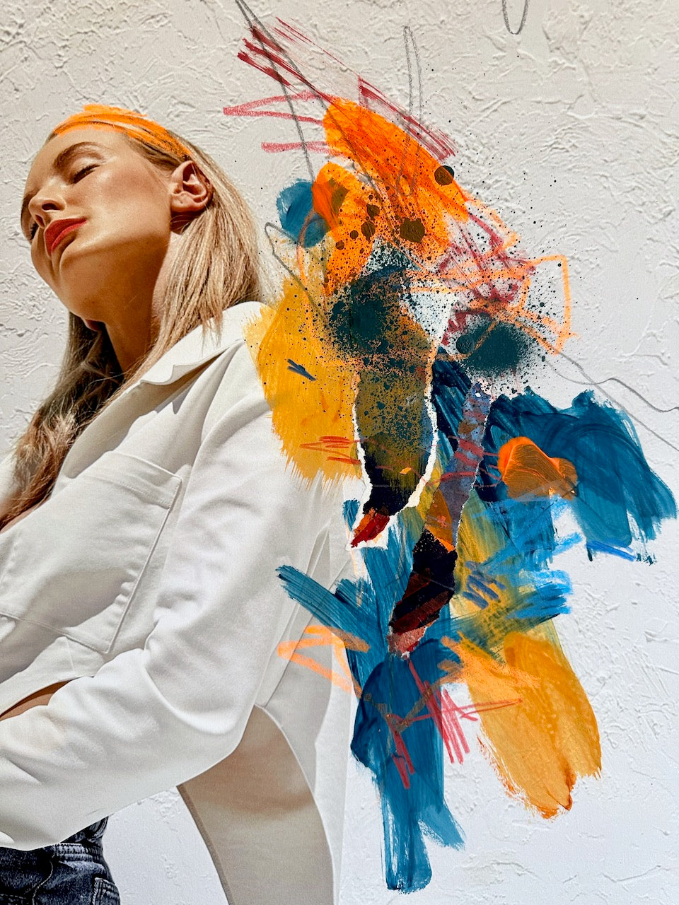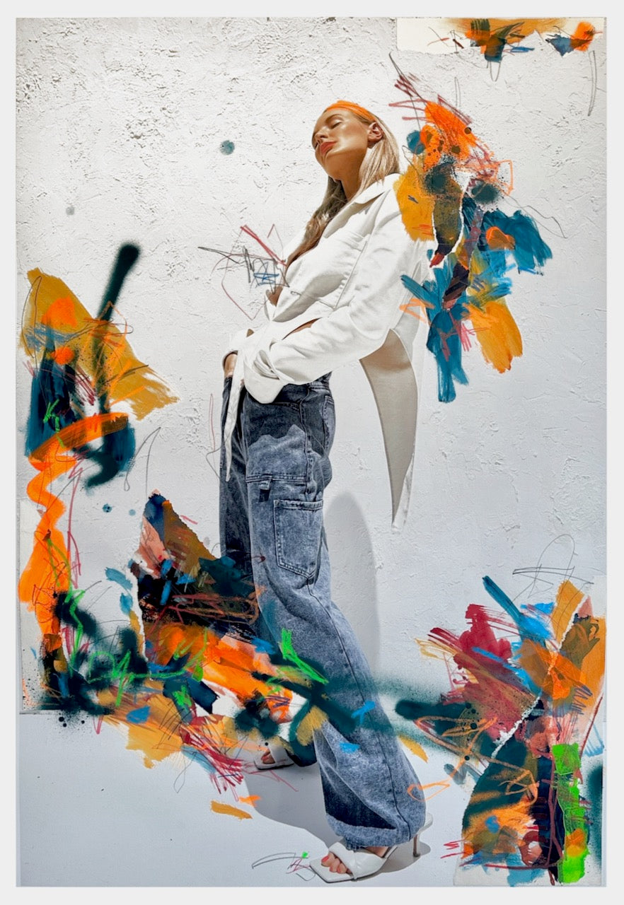 Memoir of a Thrill Seeker captures the electric essence of a daring spirit through fusing the fashion photography with abstract expressionism of Tish Willo. The effortless pose of the muse is surrounded by vivid streaks and erratic marks, evoking a sense of energy and rebellion.