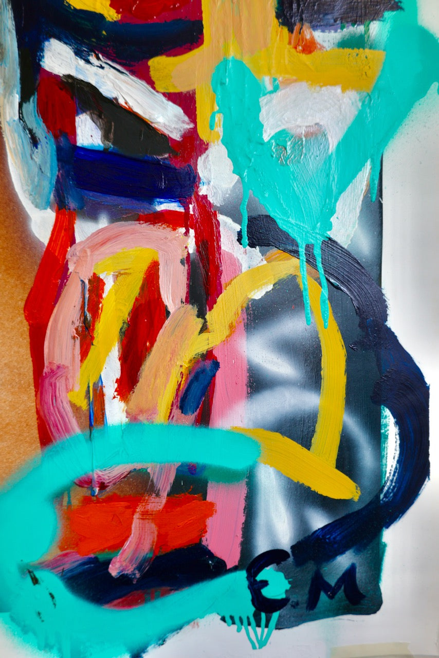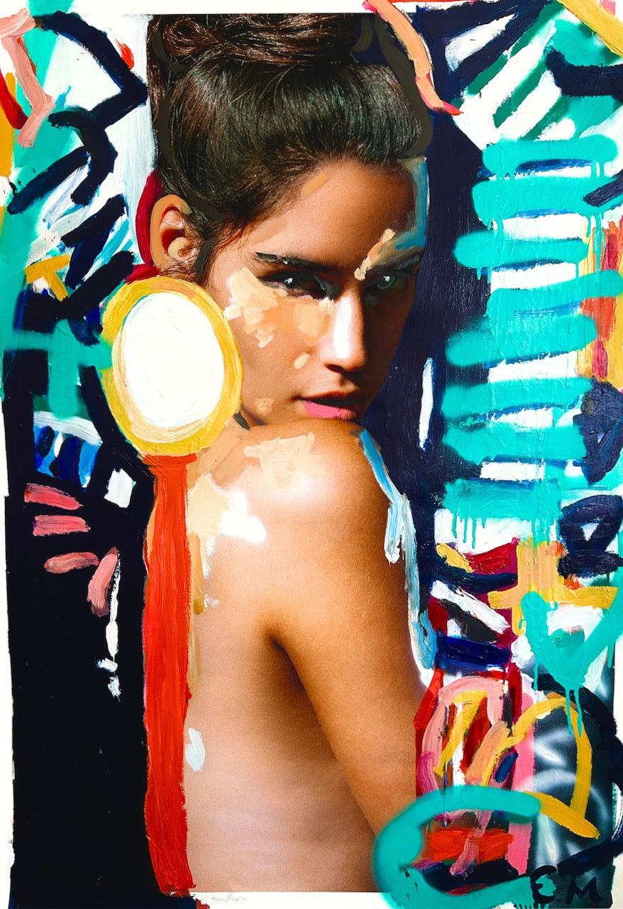 The original photographic image is printed with archival pigment inks on 310gsm Ilford cotton rag paper. Spray-painted marks and thick brushstrokes of acrylic have been hand-painted by Emmaleen directly onto the supersized, museum-grade photographic print.